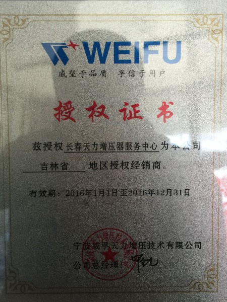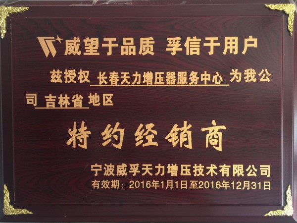 证书编号: 12 证书名称: 吉林省地区授权经销商 发证机构: 宁波威孚天力增压技术有限公司 生效日期: 2016年01月01日 截止日期: 2016年12月31日 认证简介: 威望于品质 孚信于客户 兹授权长春天力增压器服务中心为我公司吉林省地区特约经销商